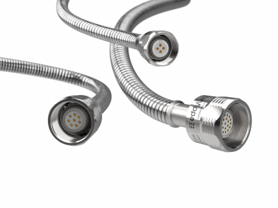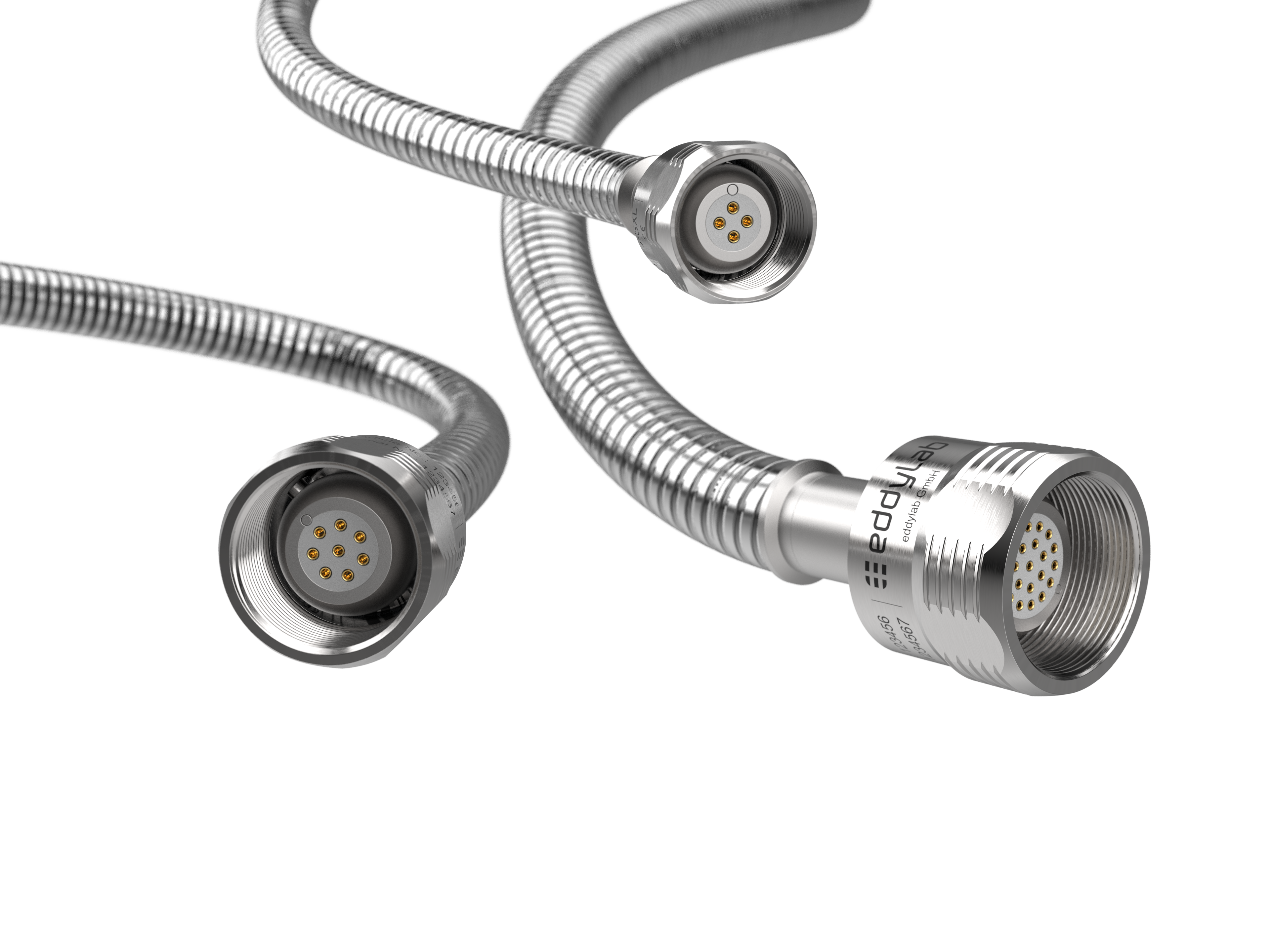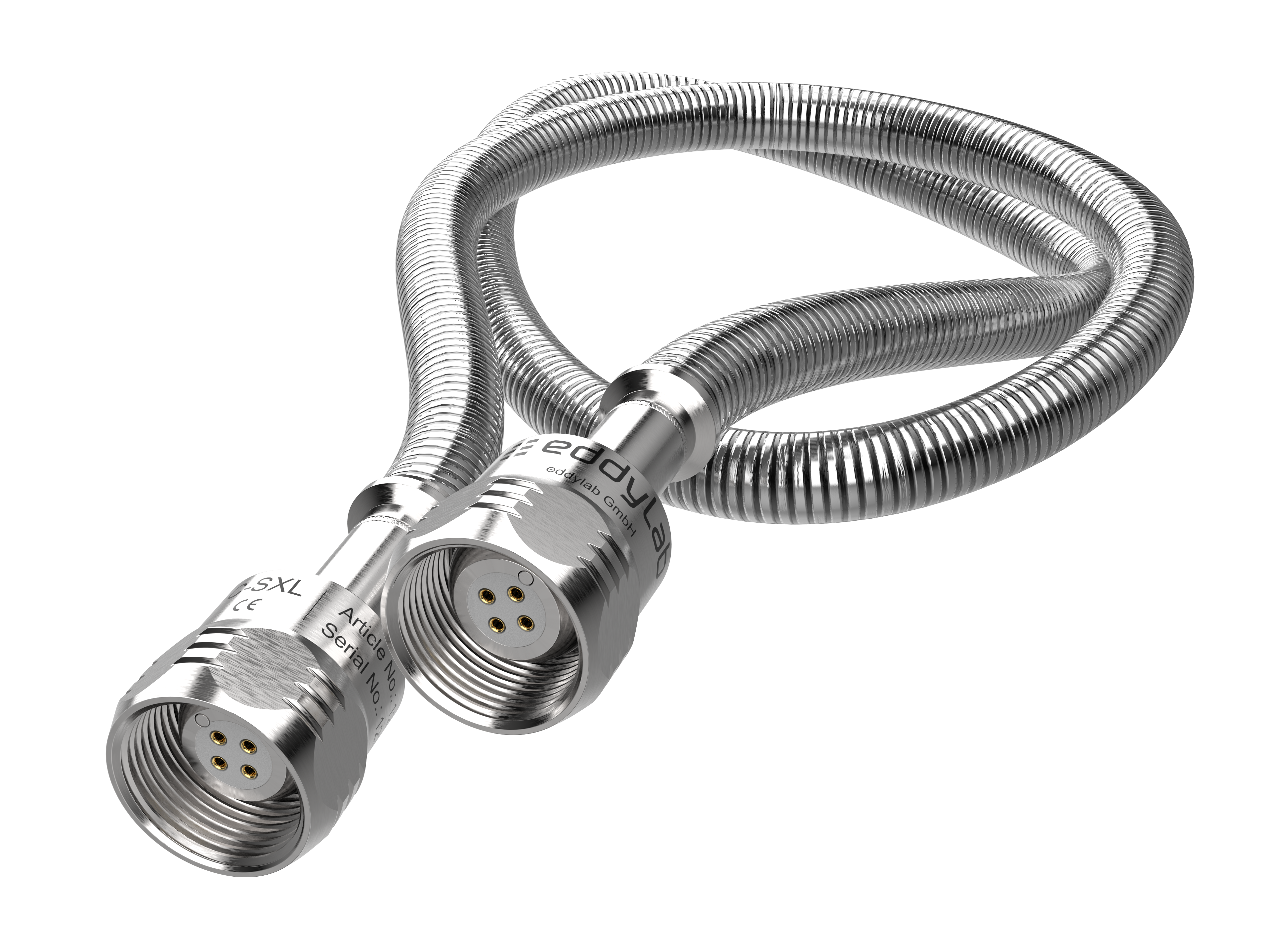 eddylab offers cabling solutions that can be qualified for use inside containment (K1 areas). Cable lengths and connector configurations can be customized according to specific customer requirements. Both the connector housings and the double-walled protective conduit are made of stainless steel. Thanks to eddylab’s patented connector design, hermetic sealing is ensured — without the use of metallic o-rings or organic sealing materials, providing exceptional serviceability, minimal maintenance and long-term reliability. The well-thought-out design of the double-walled protective conduit ensures not on hermetic sealing but also prevents kinking or damage, maintaining the functionality of the cable system even under demanding conditions. Preassembled and fully wired connection cables are available. Cable ends can be equipped with connectors or open leads.